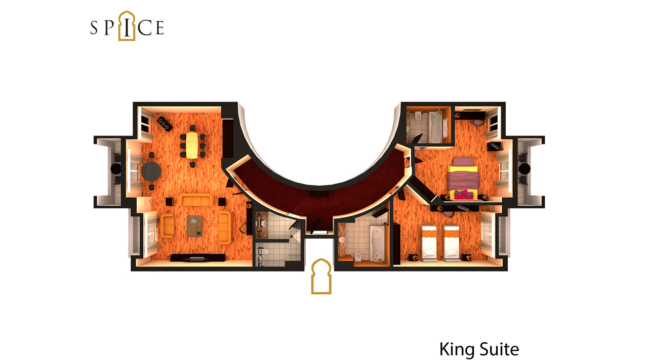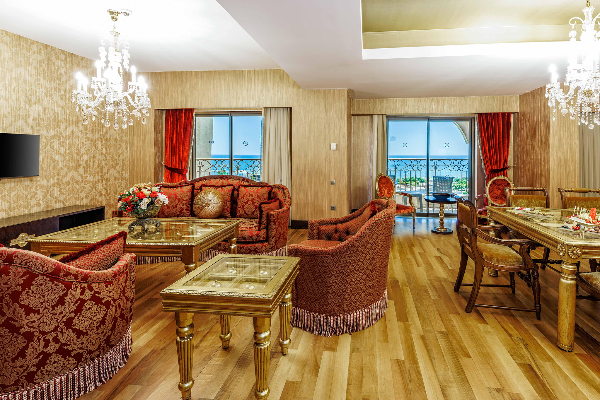 Two of these suites (185 m2) have two views, one of which is in deep blue color and another is a brief glimpse of the great Taurus Mountains. There are 2 bedrooms, 2 bathrooms with Jacuzzi, a special styled mirrored restroom, a wide and great decorated living room that is with a dining zone and balconies. Flooring – parquet and carpet.