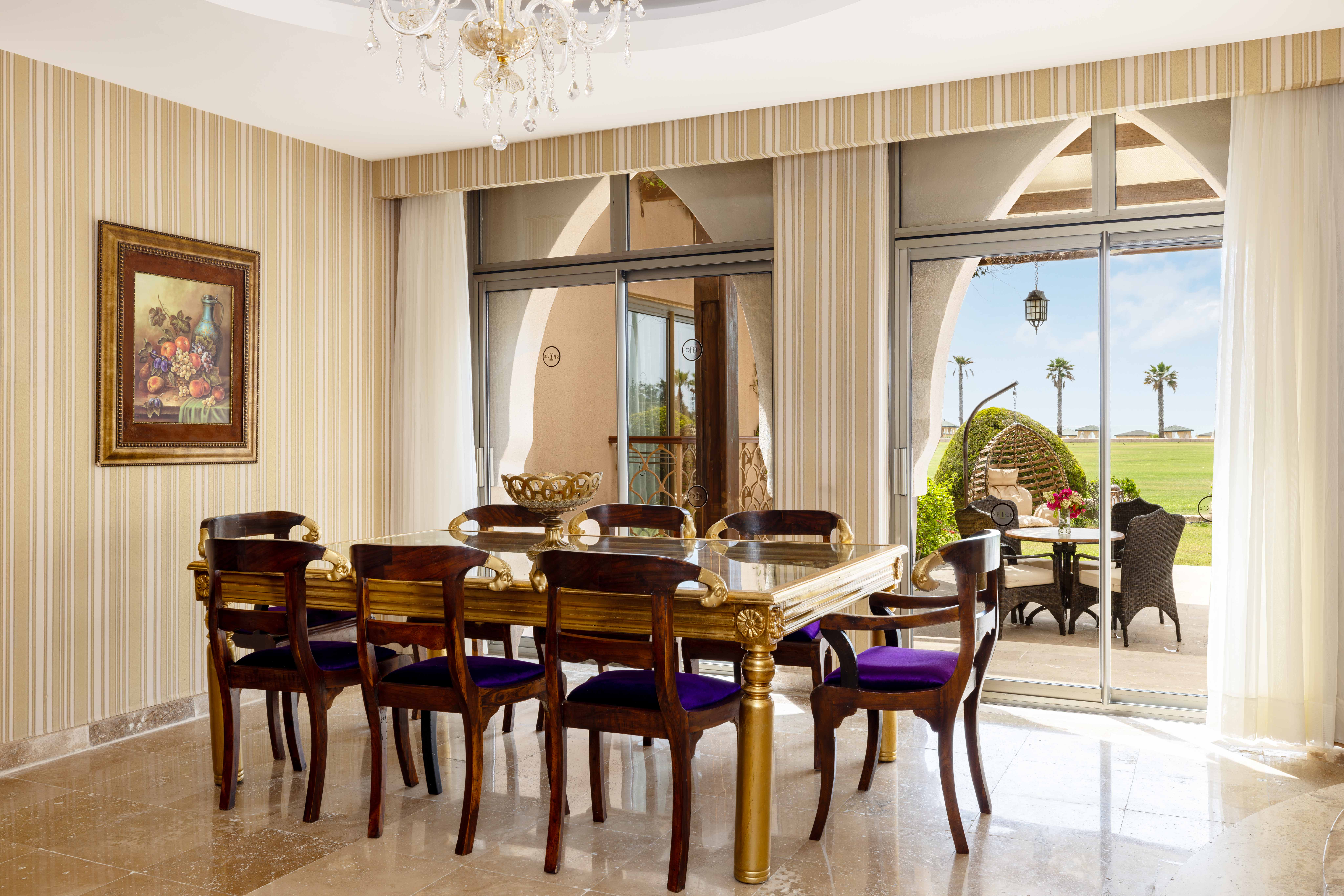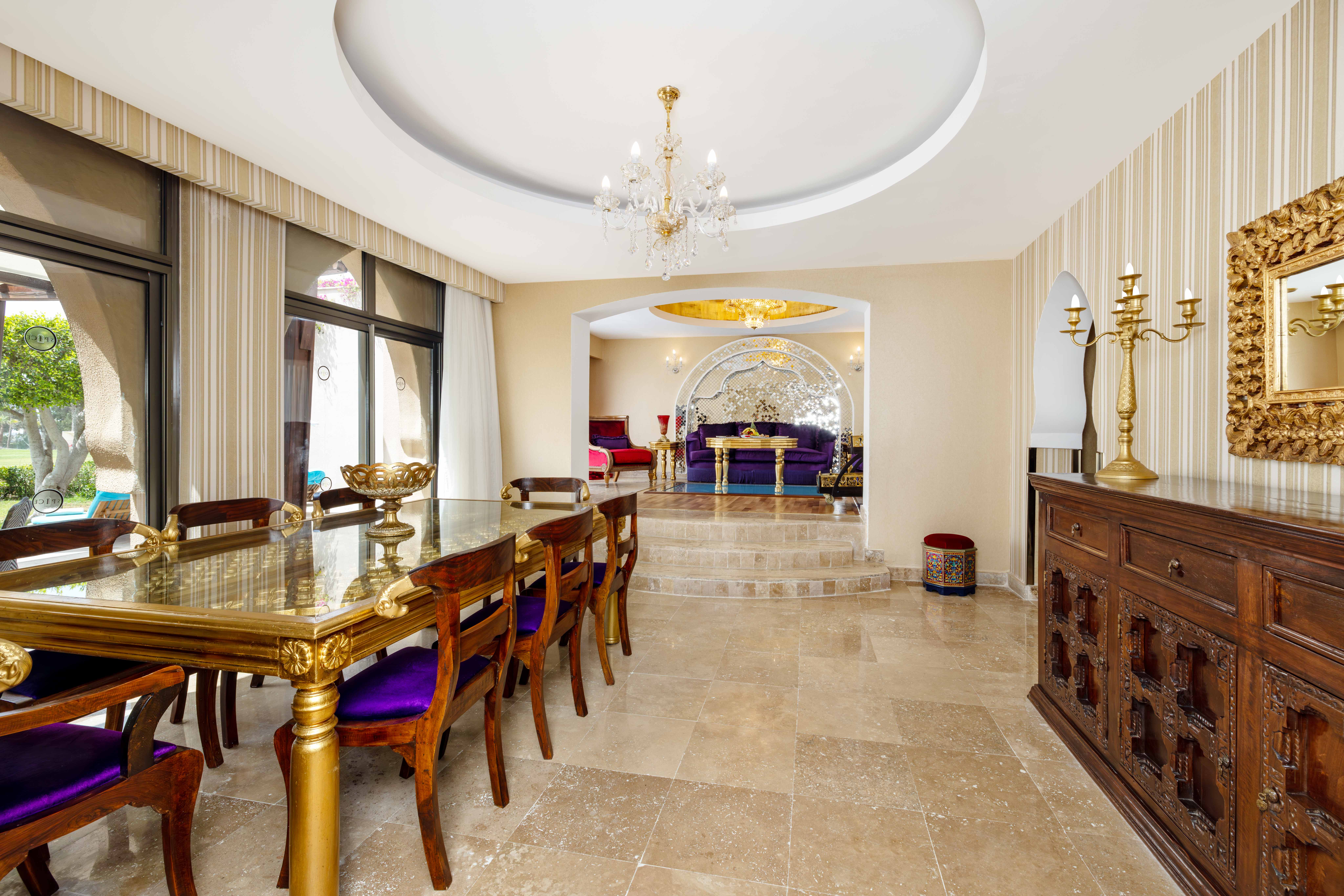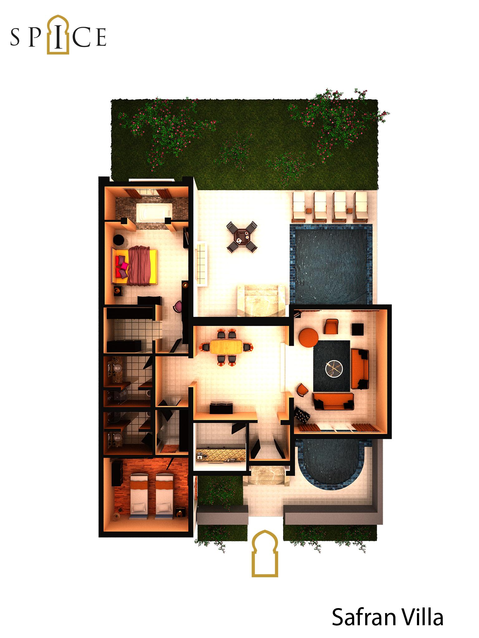Each of the 5 "one-storied Safran Villas" occupies an area of 185 m². A Safran Villa consists of 2 bedrooms with private bathrooms in each, jacuzzi, a kitchen, an unseparated dining room, private garden and private pool. The private pool extends towards the front garden under the living room where you can watch the people swimming via the glass-floor.